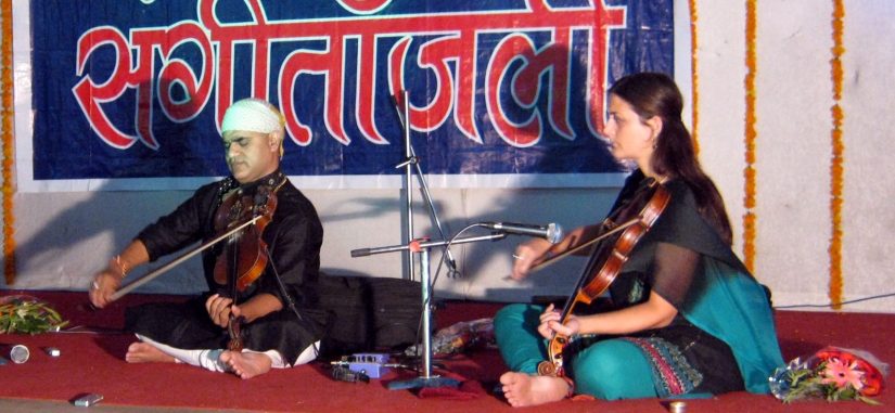 Back in Scotland I started taking violin lessons once a month, and within a year I started playing simple duets with other violinist friends. At the end of November 2007 I came back to India for an ‘unlimited’ amount of time… Initially I wanted to learn Hindi, yoga, ayurveda, and teach English to children. I knew nothing about Indian classical music at the time but I travelled with my violin so I could still practise it. It was my friend and ‘sound architect’ Michael Northam who encouraged me to learn Indian violin and introduced me to Pt. Sukhdev Prasad Mishra from Varanasi (Banaras). I wasn’t sure I wanted to embark on such an endless journey as Indian classical music, bit I started taking classes with Pt. Sukhdev Mishra in April 2008…